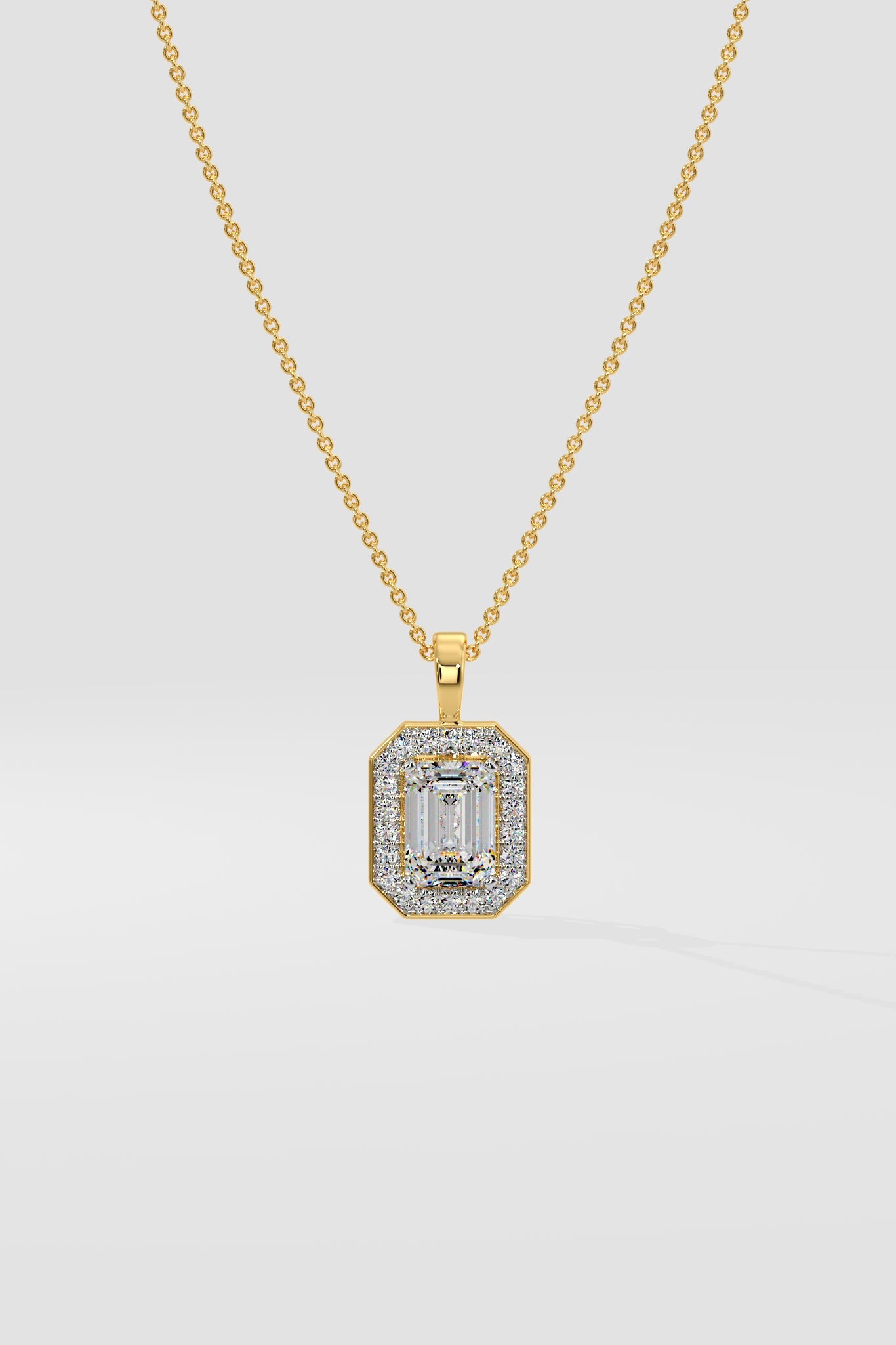 The Emra Pave Pendant features a 1 ct emerald center embraced by a sparkling pave set halo. Minimal, beautiful, perfect for everyday wear. Optionally can be made in Rose or White gold.