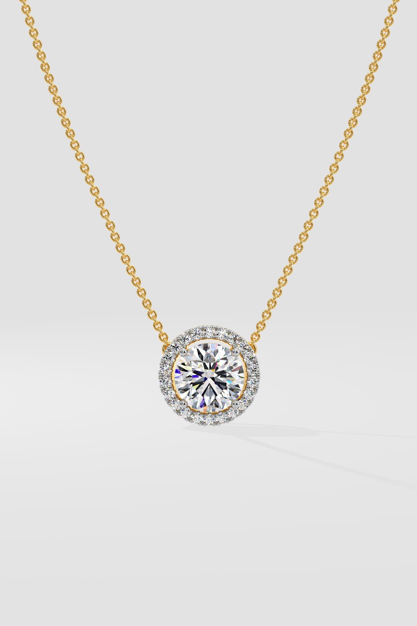 The classic solitaire necklace features a 1 ct center with a halo. Color options are available in Rose, Yellow, and white gold. Perfect for everyday wear or gifting.
