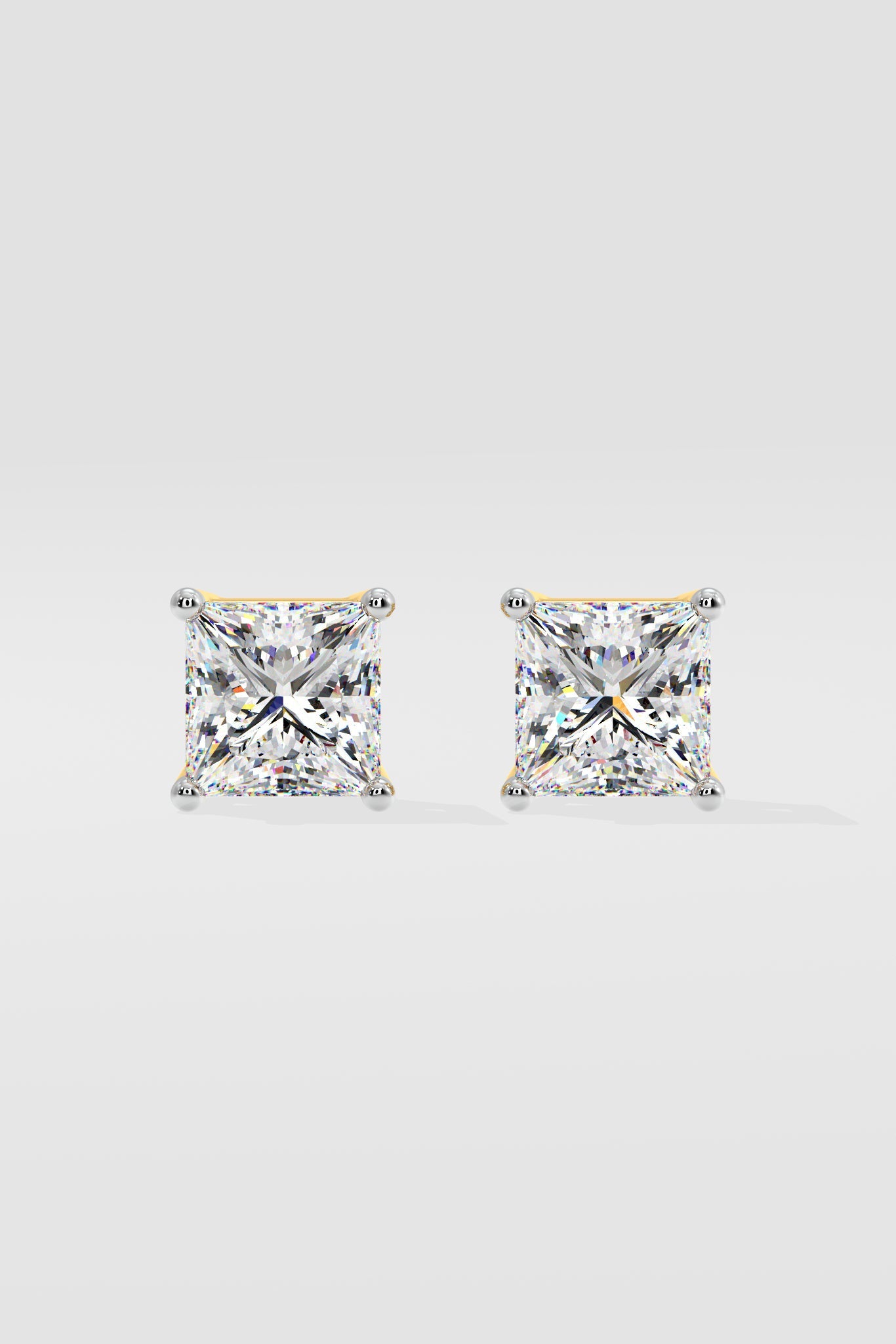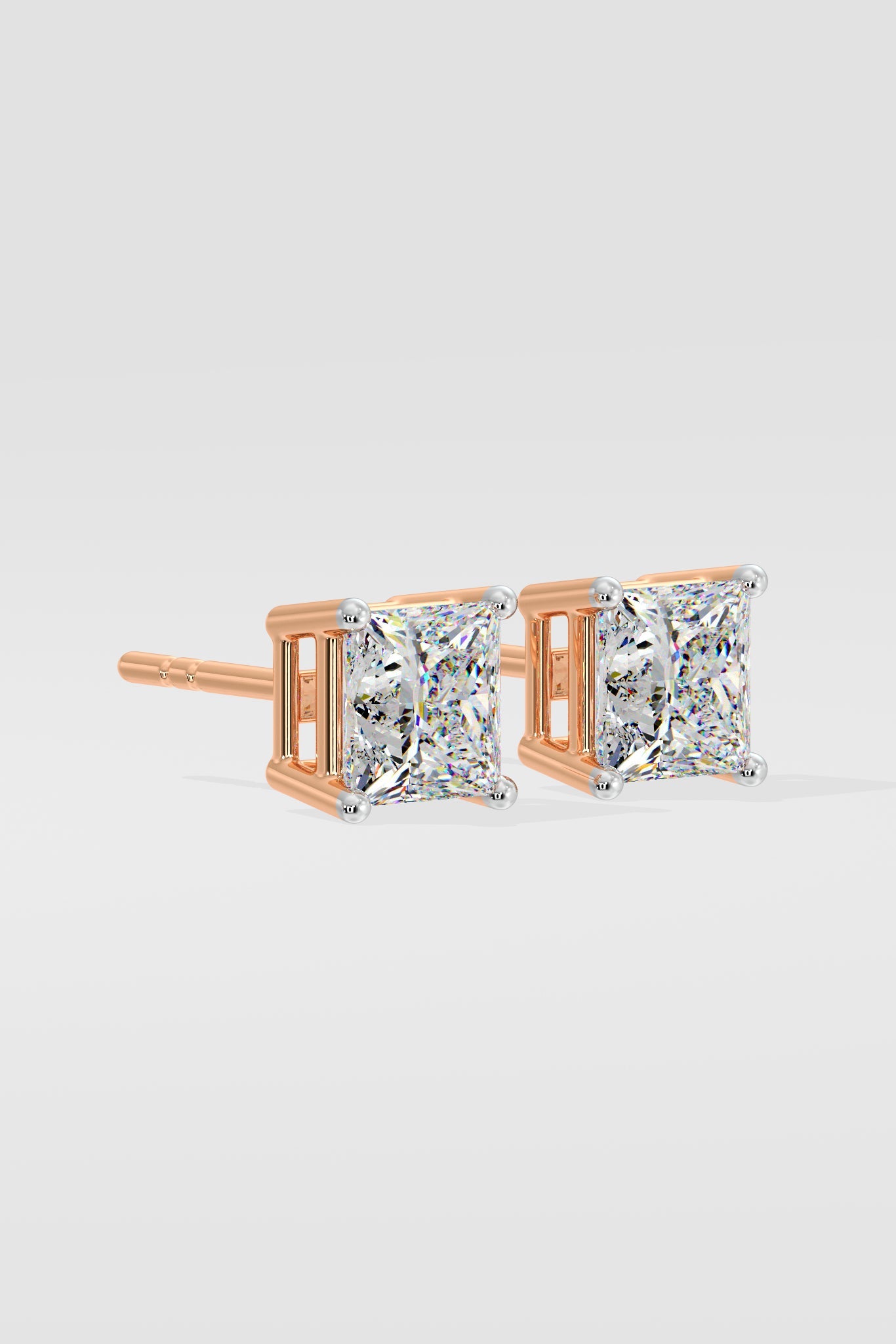 The classic Princess studs, set in 4 prongs are 1.5 ct each diamond. Princess has a bolder, edgier look and breaks away from the classic round to make a stronger yet classic statement. Princess continues to hold high sparkle and combines everyday work and play effortlessly. Customizable in rose or white gold options as well.