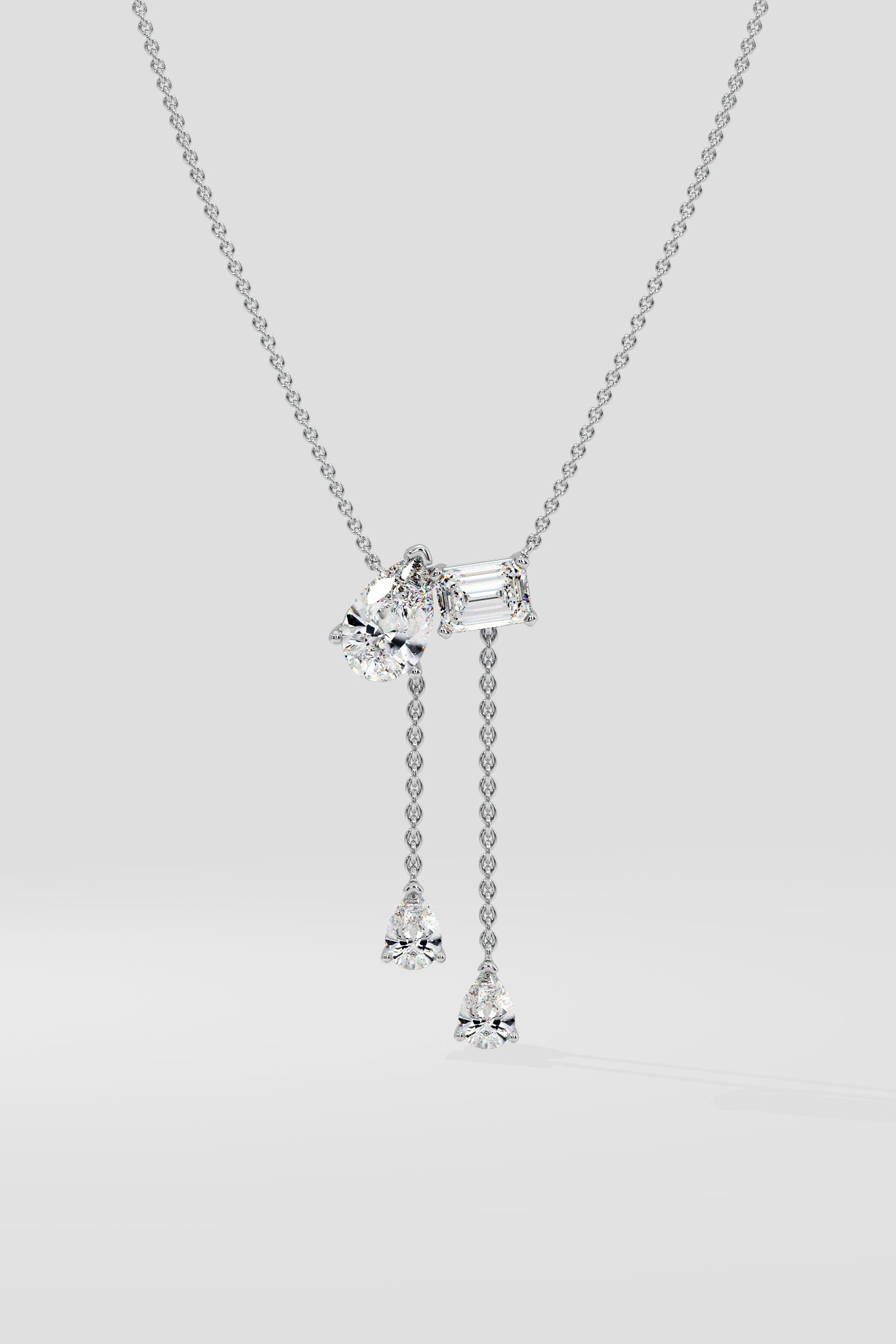 The 2 Stone Solitaire Necklace features 1 ct Solitaires each, in Emerald and Pear. An enhancement of the classic solitaire pendant, these 2 stone diamonds drops sit well on the collarbone.