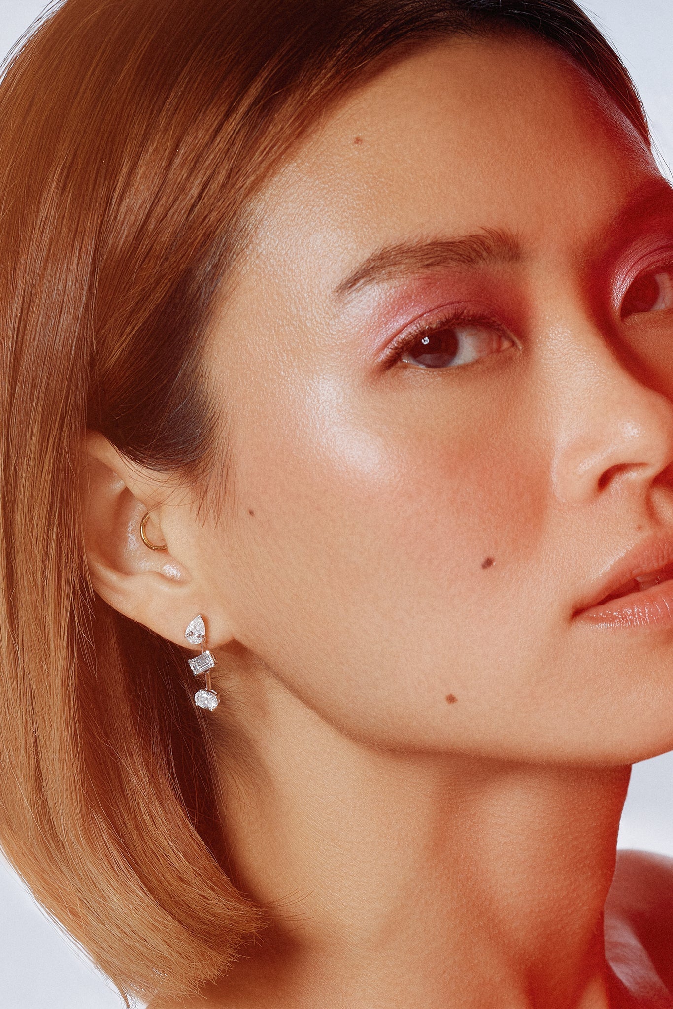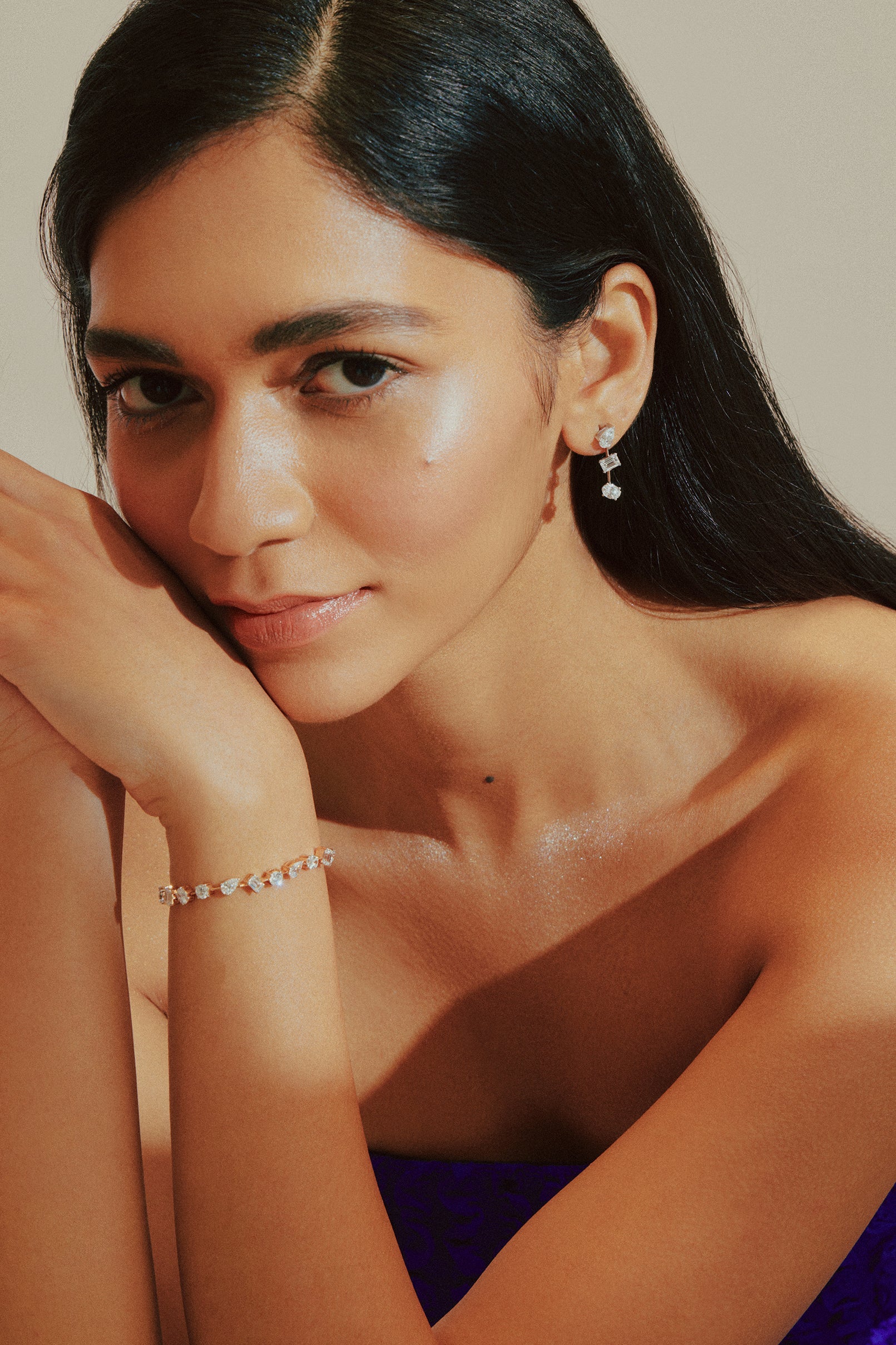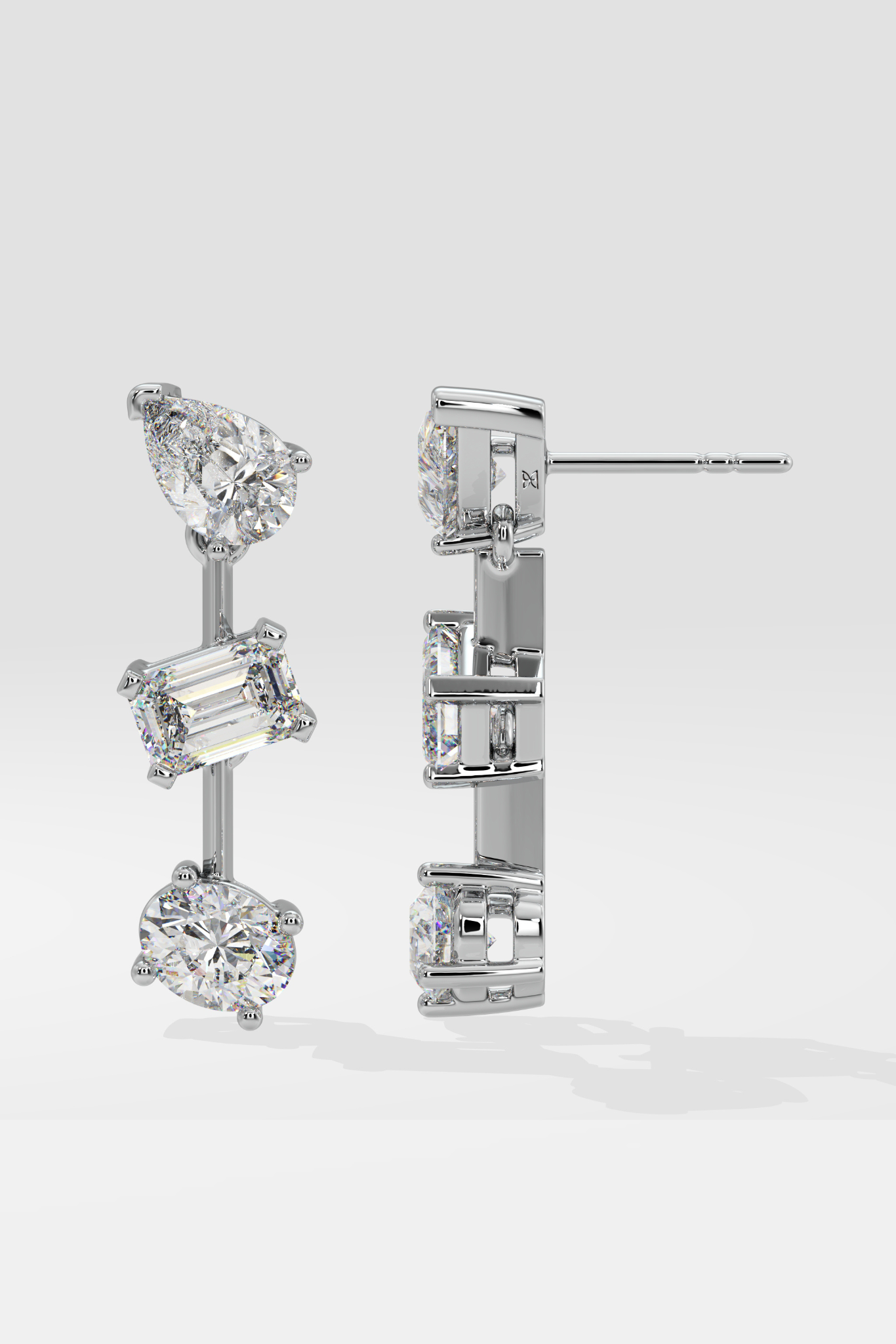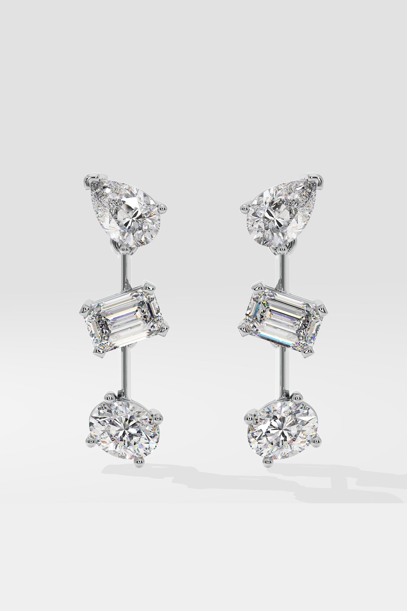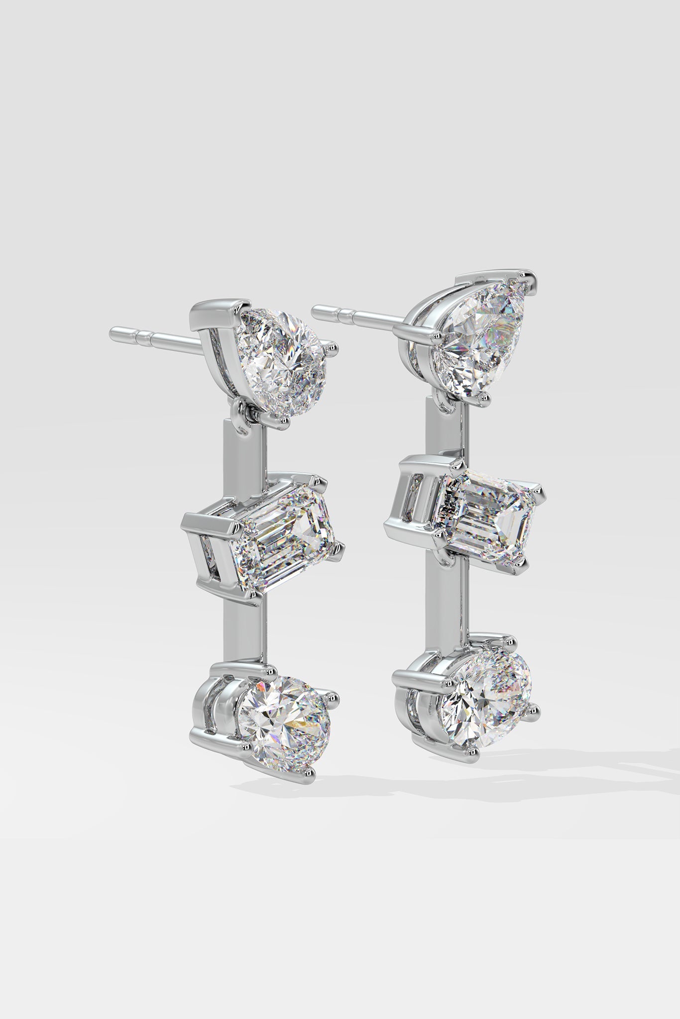 The 3 stone danglers are classic miced shape dangler earrings in 1/2 ct. solitaires. Perfect for date nights, evenings, and celebrations. Step into the spotlight.