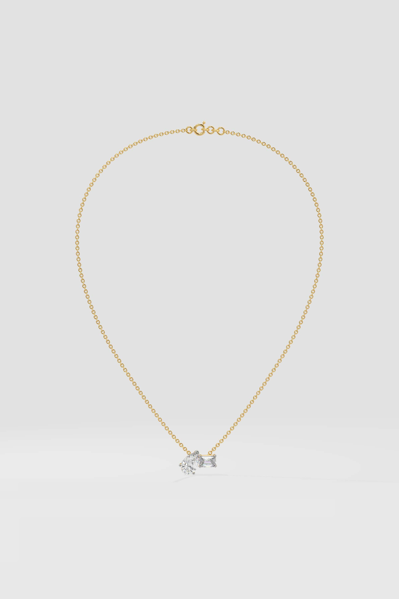 Unleash the power of the Pear & Emerald duo twist Necklace and make a statement! This stunning piece features not one, but two dazzling diamonds - a 1/3 ct Pear diamond and a 1/3 ct Emerald cut. The twisted design adds a modern touch to your everyday style, making you stand out from the crowd. Whether it's for yourself or someone special, this necklace is sure to be cherished forever.