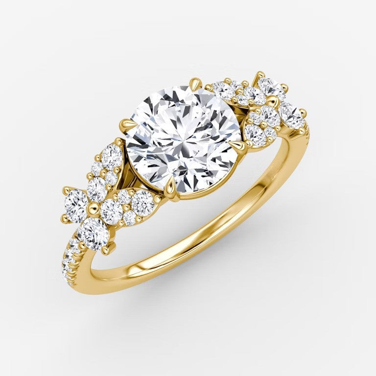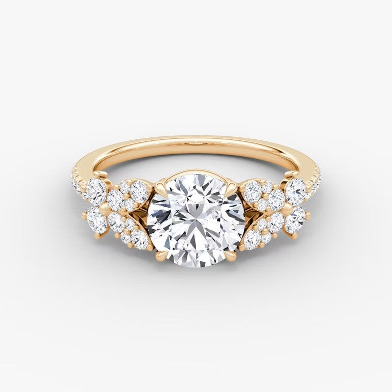 Introducing the Marigold Round Lab Diamond Ring, a stunning choice for engagements or special gifts. Its delicate garden bloom design and sparkling lab grown diamonds offer a perfect blend of beauty and sustainability. Embrace the elegance and eco-friendliness of this expertly-crafted ring today. Pavé band included.