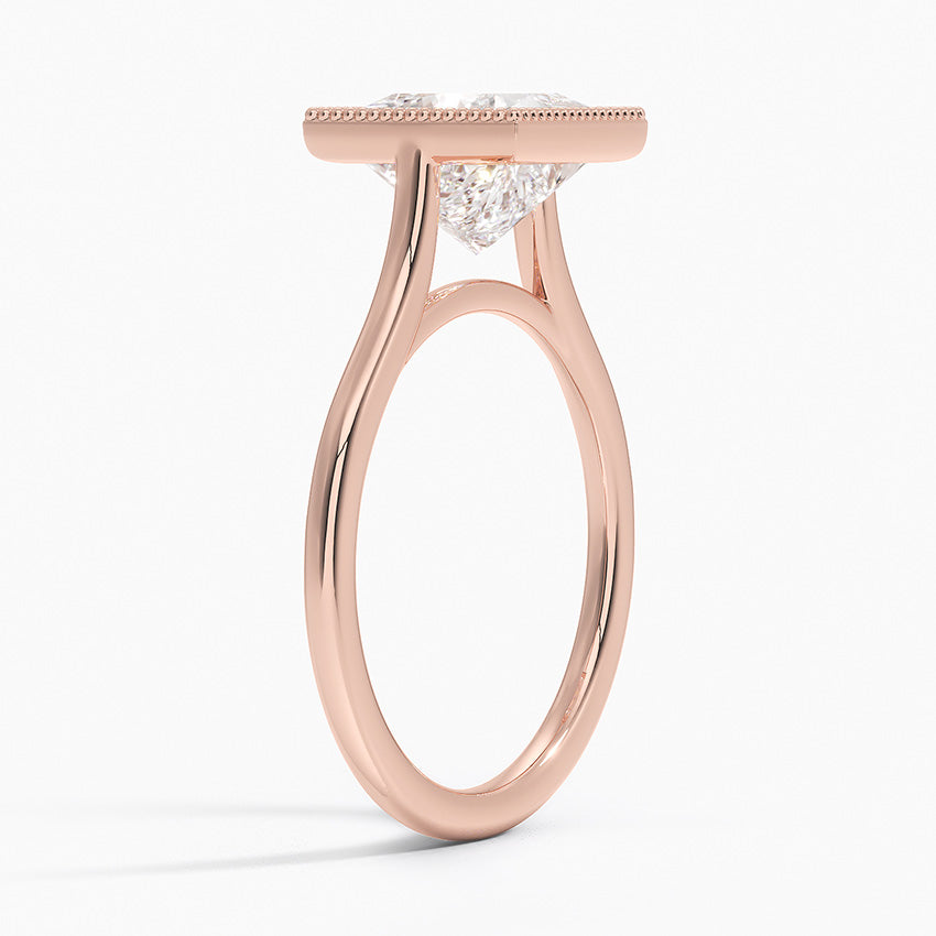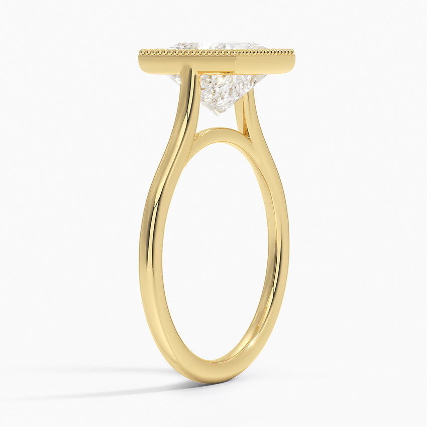 This beautiful, contemporary ring features a bezel-set center gem with milgrain accents for a unique look. The elevated bezel allows for maximum light play and accommodates a variety of wedding band styles to tuck underneath.