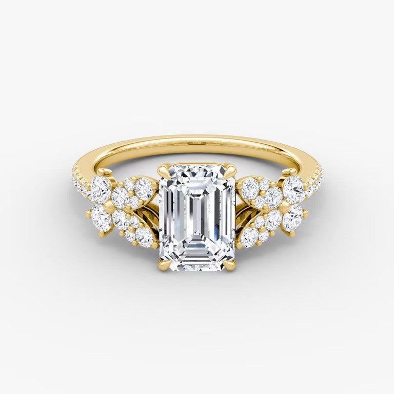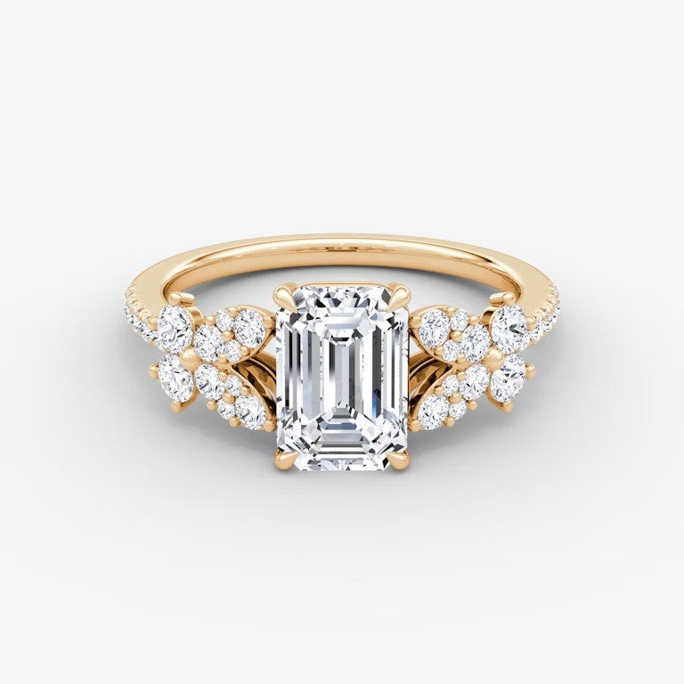 Introducing the Marigold Emerald Lab Diamond Ring, a stunning choice for engagements or special gifts. Its delicate garden bloom design and sparkling lab grown diamonds offer a perfect blend of beauty and sustainability. Embrace the elegance and eco-friendliness of this expertly-crafted ring today. Pavé band included.
