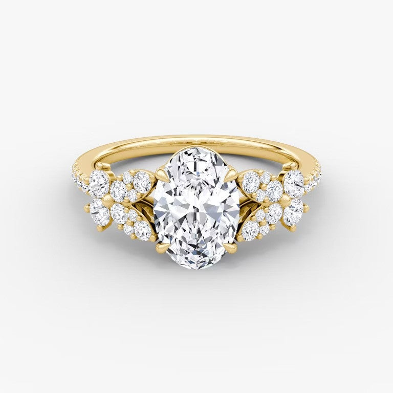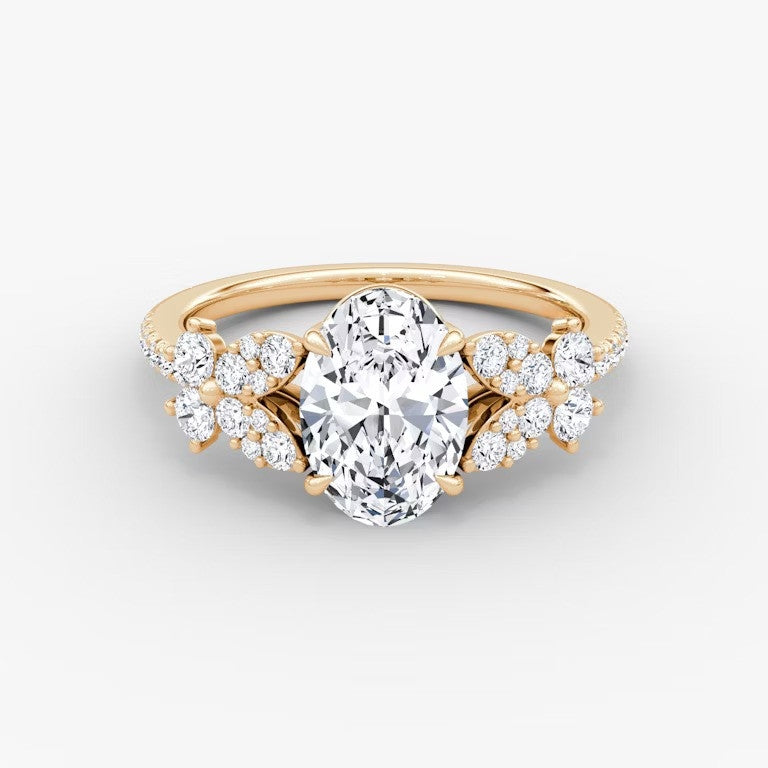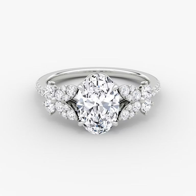 Introducing the Marigold Oval Lab Diamond Ring, a stunning choice for engagements or special gifts. Its delicate garden bloom design and sparkling lab grown diamonds offer a perfect blend of beauty and sustainability. Embrace the elegance and eco-friendliness of this expertly-crafted ring today. Pavé band included.