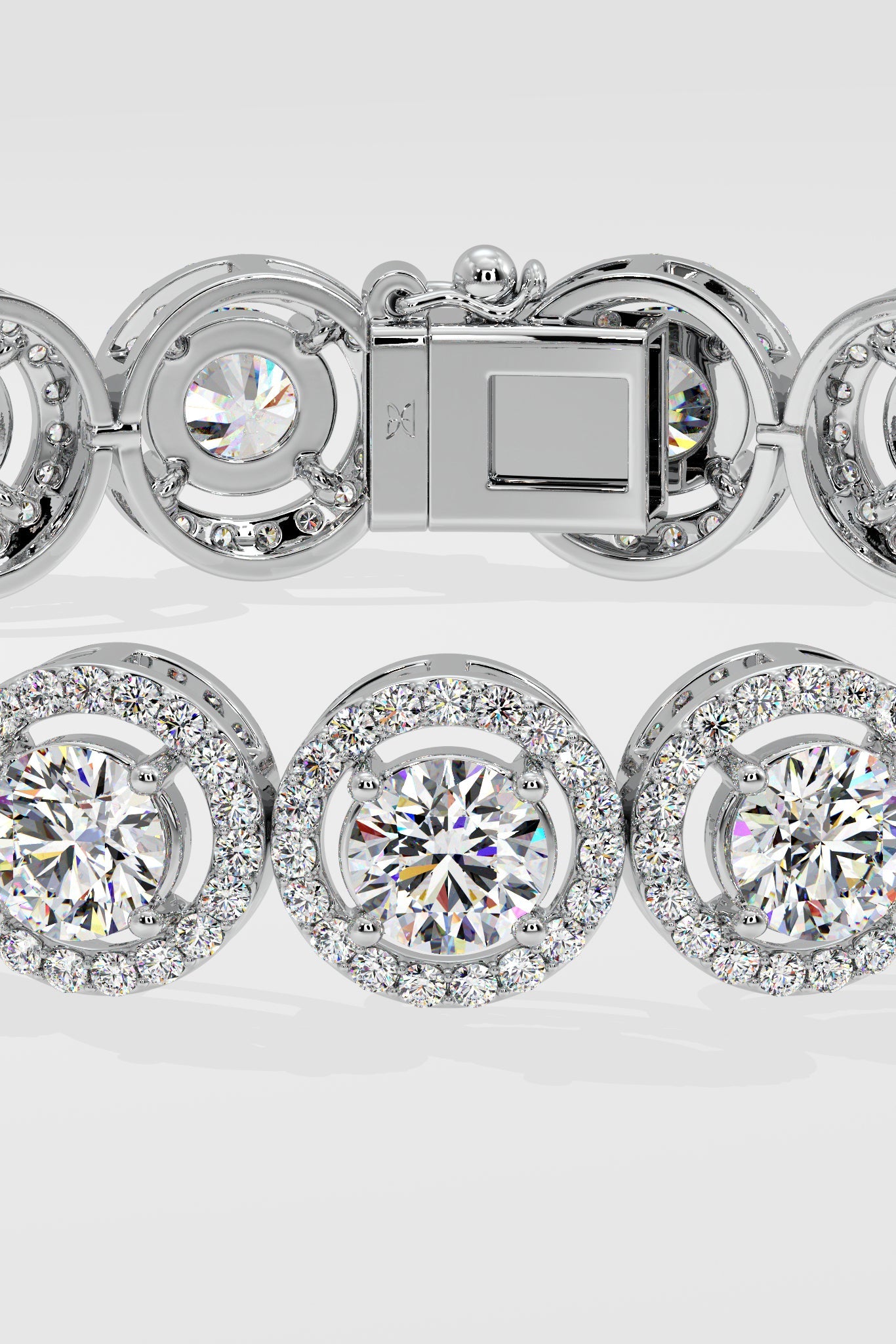 The Marina Bracelet is a stunning 16 ct Diamond Bracelet with 0.90 ct each diamond center with a halo. Shine, radiate, and illuminate the room with this magnificent stunner on your wrist.