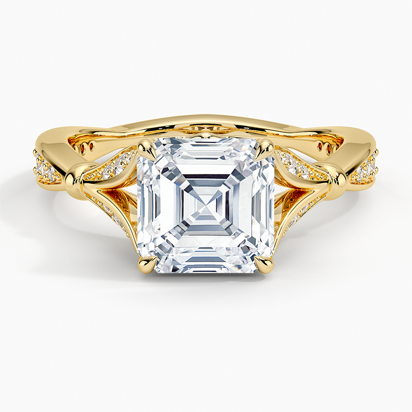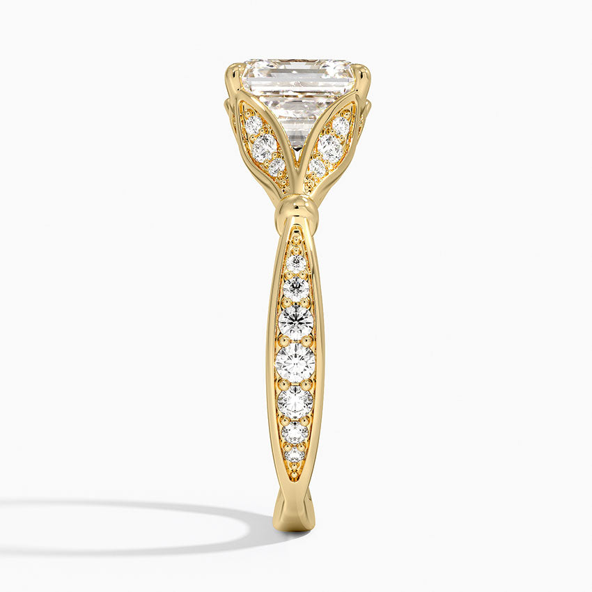 Elegant and timeless, the Petunia Asscher Lab Diamond Engagement Ring features a striking centre stone surrounded by open petals. Adorned with lab-grown diamonds in a pave petal design, this quintessential ring is perfect for those who cherish classic beauty.
