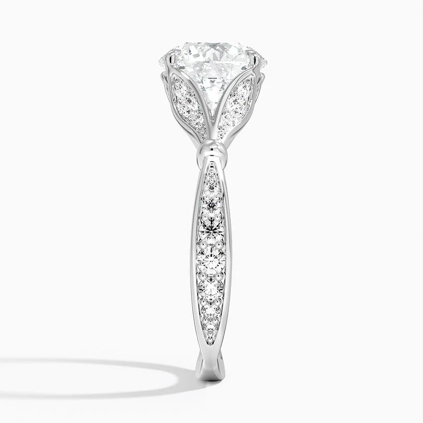 Elegant and timeless, the Petunia Round Lab Diamond Engagement Ring features a striking centre stone surrounded by open petals. Adorned with lab-grown diamonds in a pave petal design, this quintessential ring is perfect for those who cherish classic beauty.