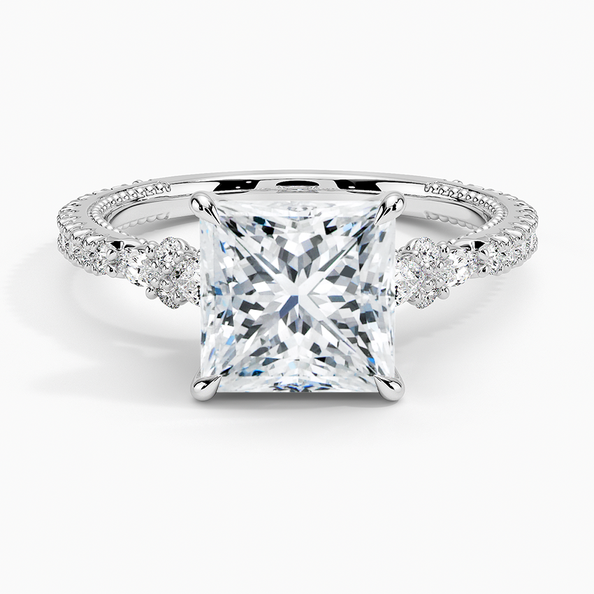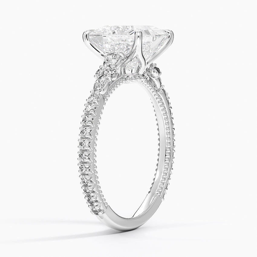 Elevate your proposal with our Roseline Princess Engagement Ring. Its unique rose petal design encrusted with lab grown diamonds and 3/4th pave adds a regal touch for a truly special moment. Make a lasting impression with this exquisite and ethically sourced ring.