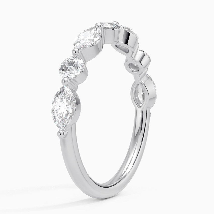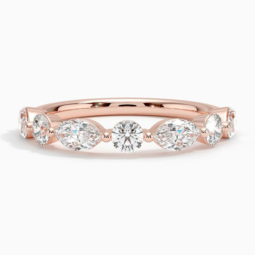 Alternating round and marquise diamonds create an alluring pattern half of the way around this chic and distinctive ring.