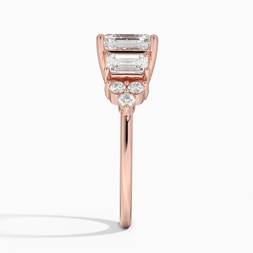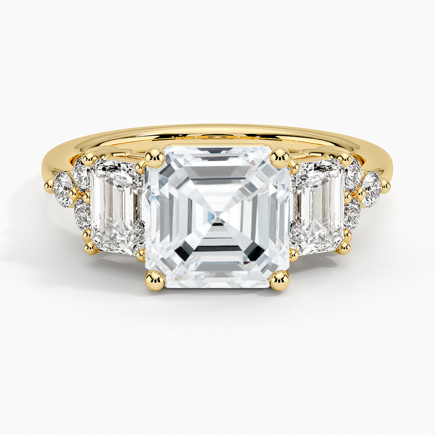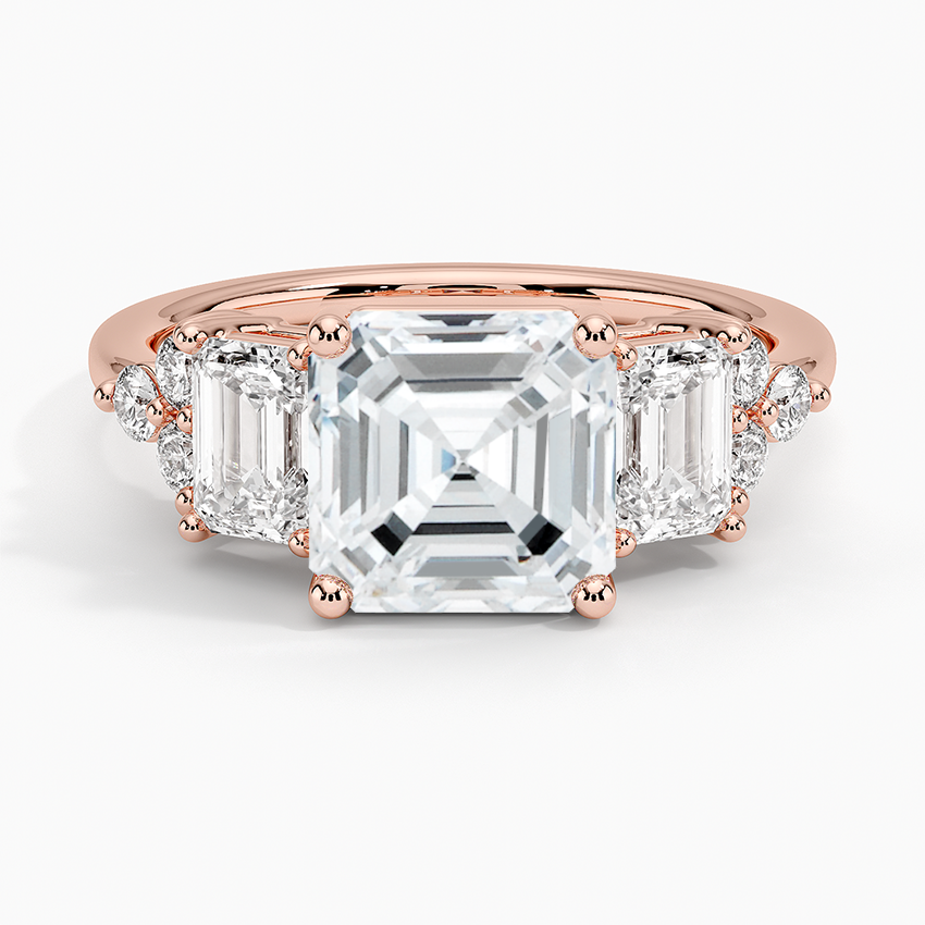 The Sabrina Three Stone Asscher Engagement Ring is a testament to elegance and style. This exquisite piece features emerald accent side stones that add a touch of sophistication to the classic three stone design. Crafted with lab grown diamonds, it offers both beauty and sustainability.