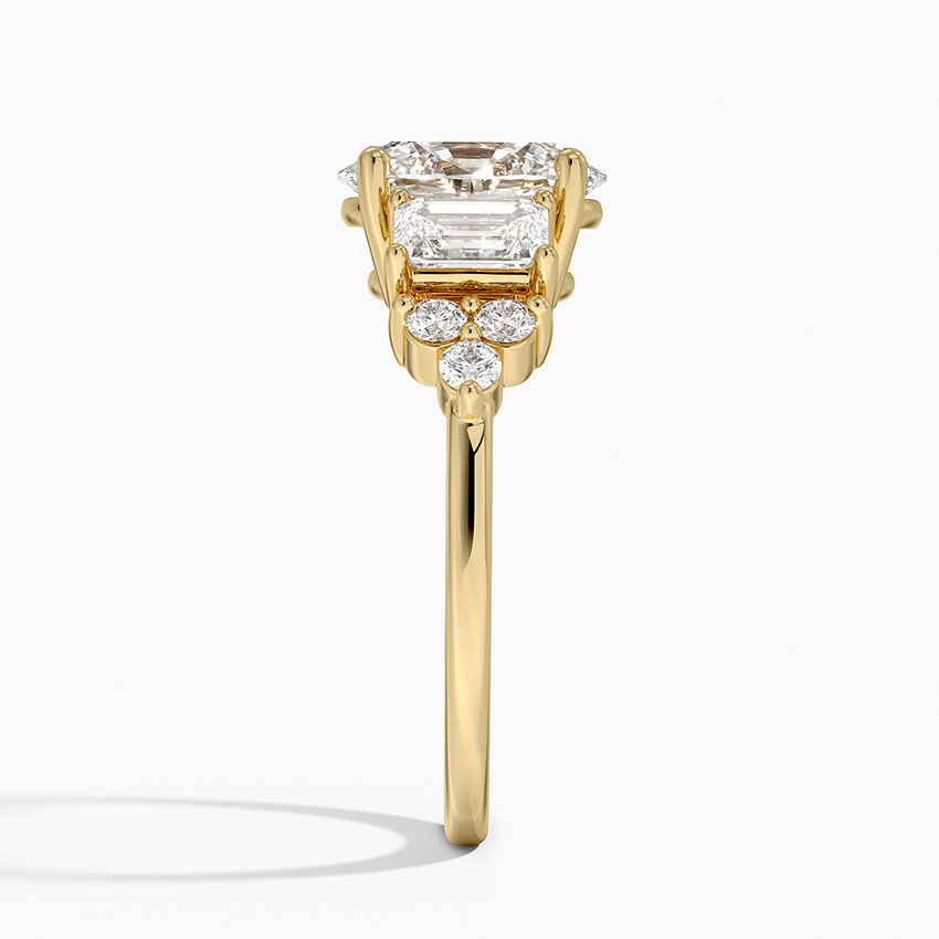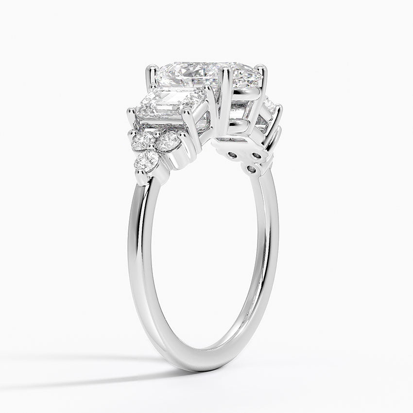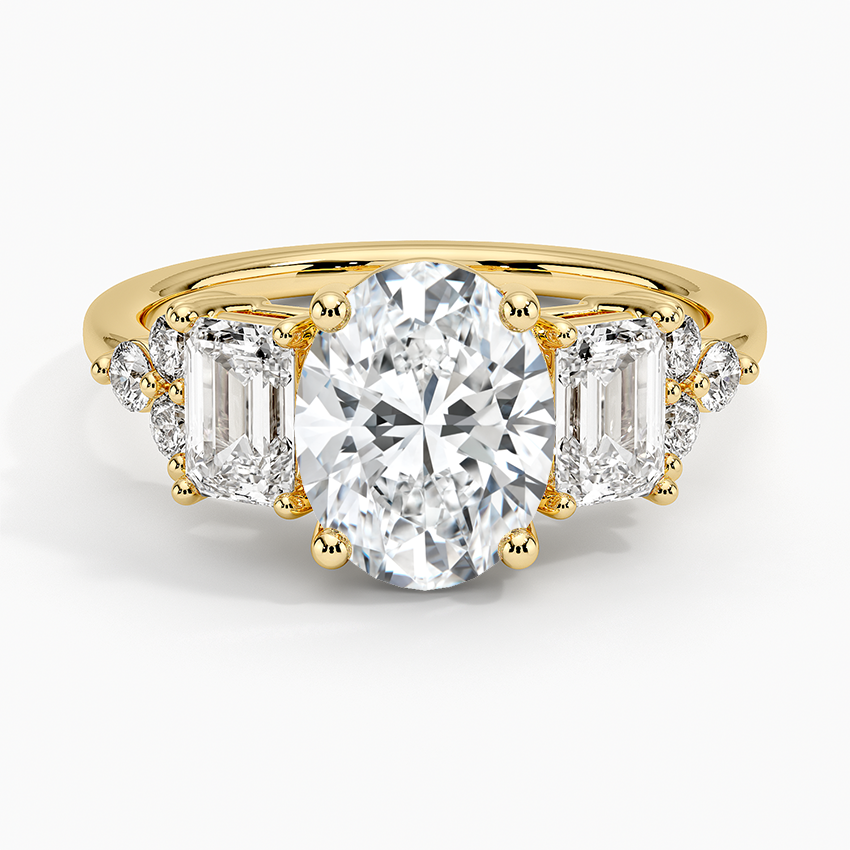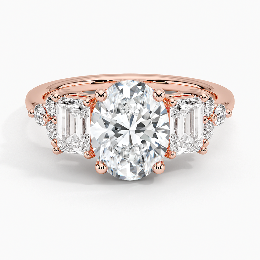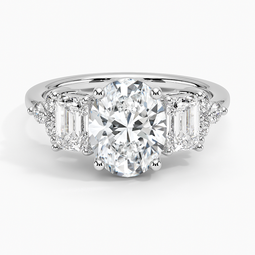 The Sabrina Three Stone Oval Engagement Ring is a testament to elegance and style. This exquisite piece features emerald accent side stones that add a touch of sophistication to the classic three stone design. Crafted with lab grown diamonds, it offers both beauty and sustainability.