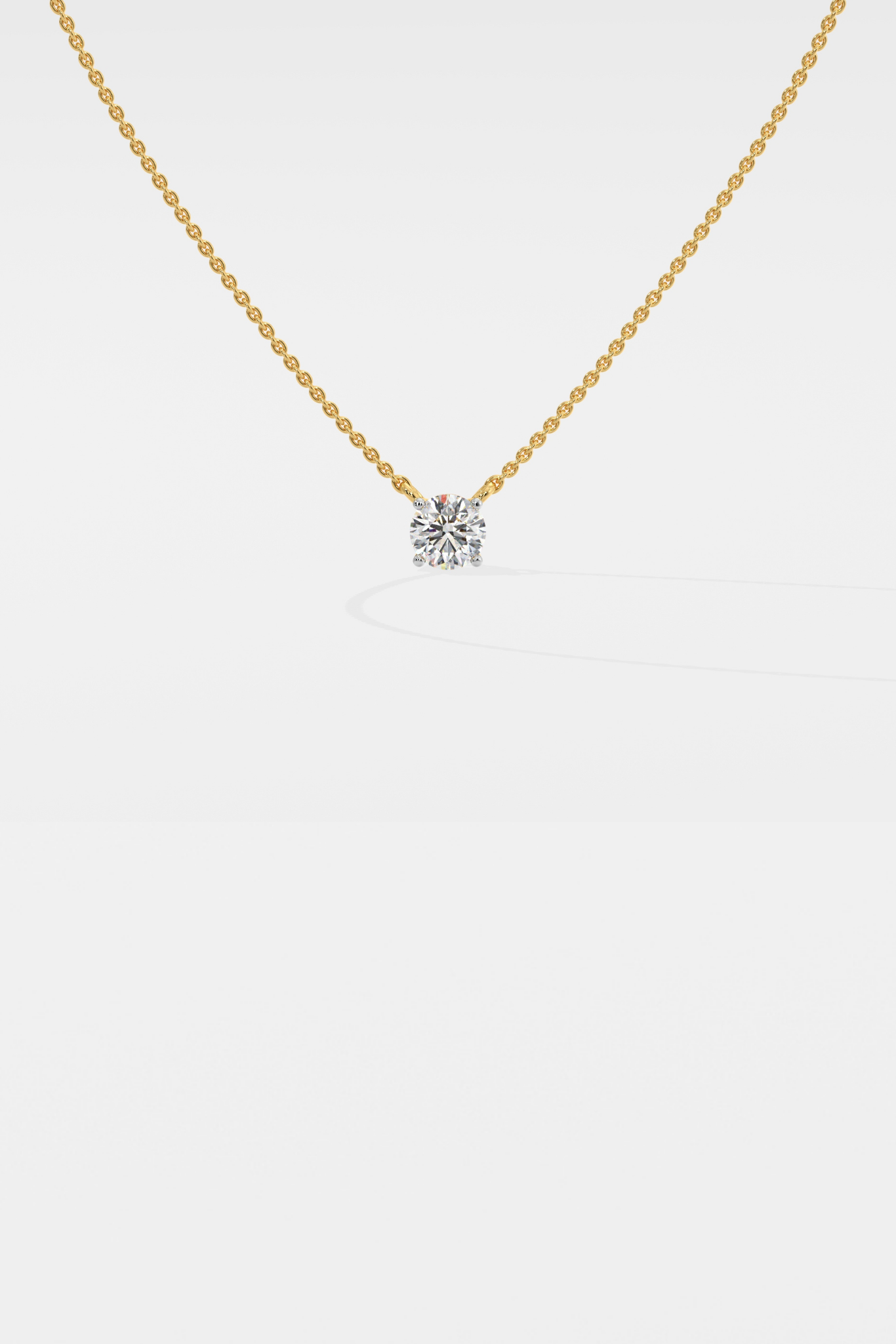 A classic solitaire pendant combines well with everything in your neck stack. This 0.75 ct round brilliant is elegance and sophistication. Classic prong setting with the dainty chain attached at an angle to let the diamond sparkle. Will look great in a rose gold option too.