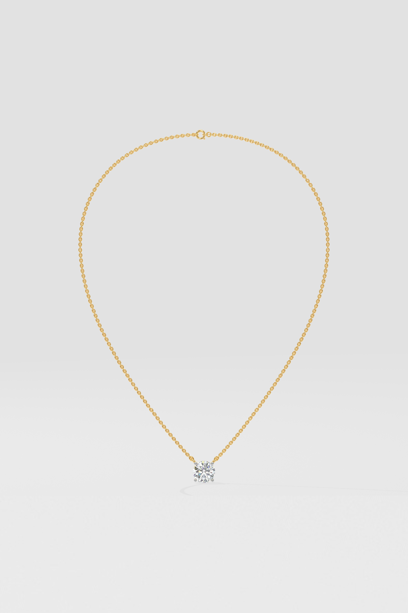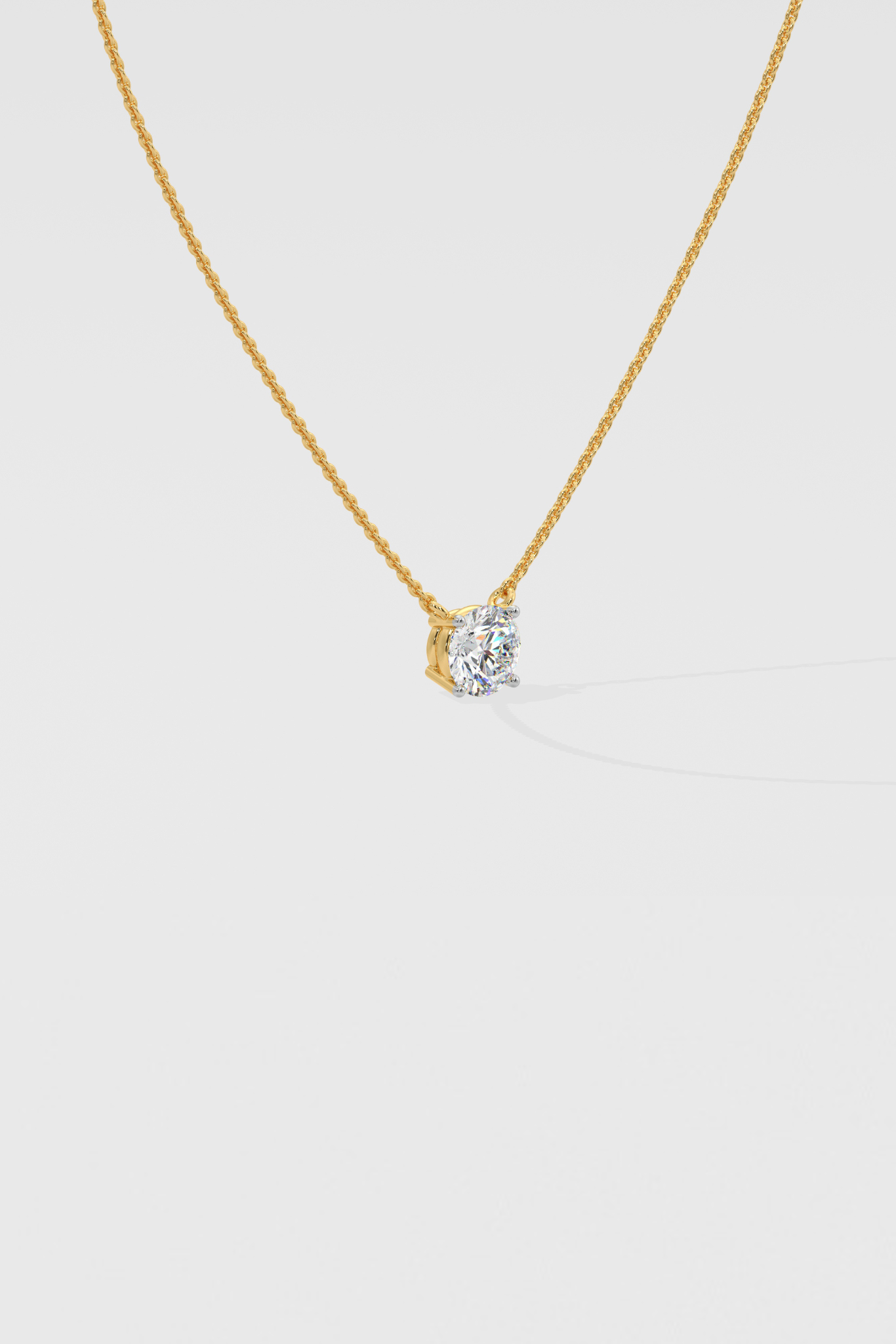 A classic solitaire pendant combines well with everything in your neck stack. This 2 ct round brilliant is elegance and sophistication. Classic prong setting with the dainty chain attached at an angle to let the diamond sparkle. Will look great in a rose gold option too.