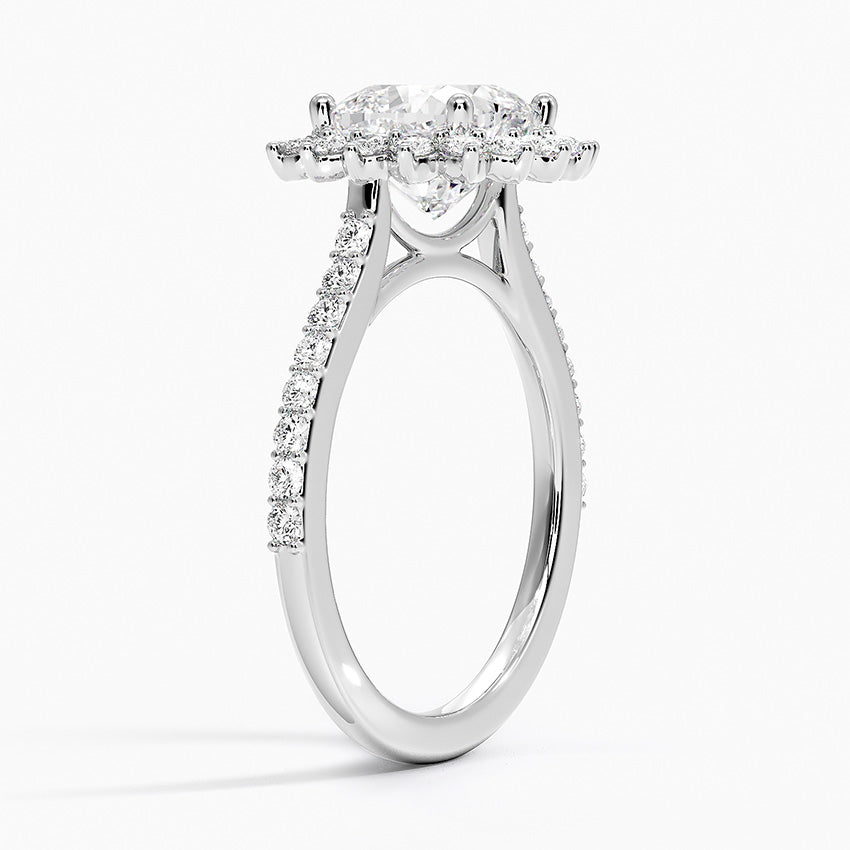 This Sun Round Lab Grown Diamond Engagement Ring features a stunning sun rays halo design, adorned with sparkling lab grown diamonds. Its pave detailing adds a touch of elegance, perfect for any special occasion wear or as an eye-catching piece for party wear. Elevate your style and make a statement with this exquisite ring.