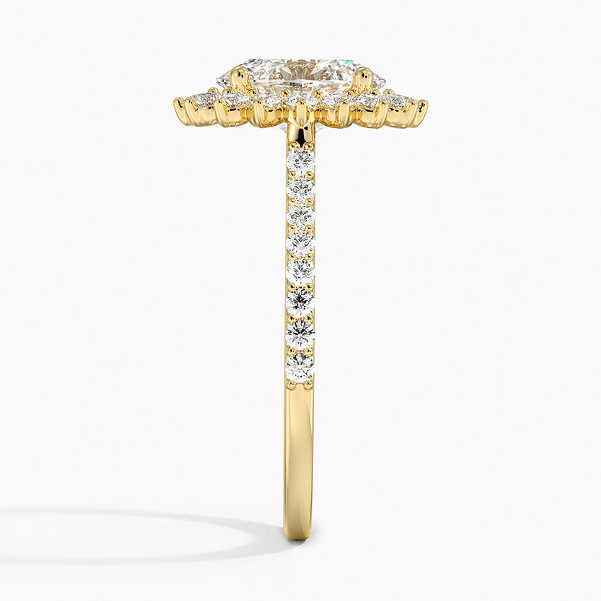 This Sun Oval Lab Grown Diamond Engagement Ring features a stunning sun rays halo design, adorned with sparkling lab grown diamonds. Its pave detailing adds a touch of elegance, perfect for any special occasion wear or as an eye-catching piece for party wear. Elevate your style and make a statement with this exquisite ring.