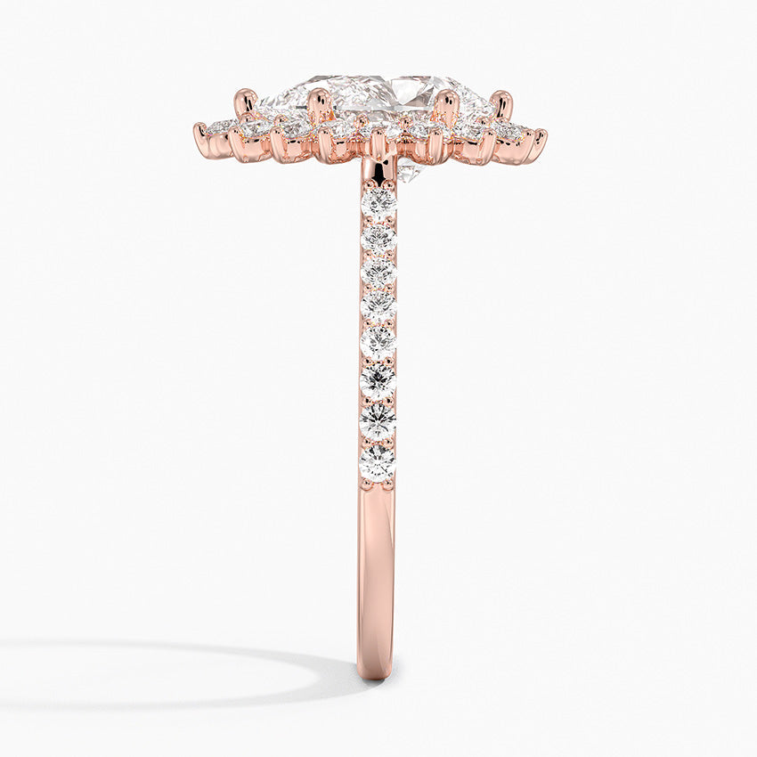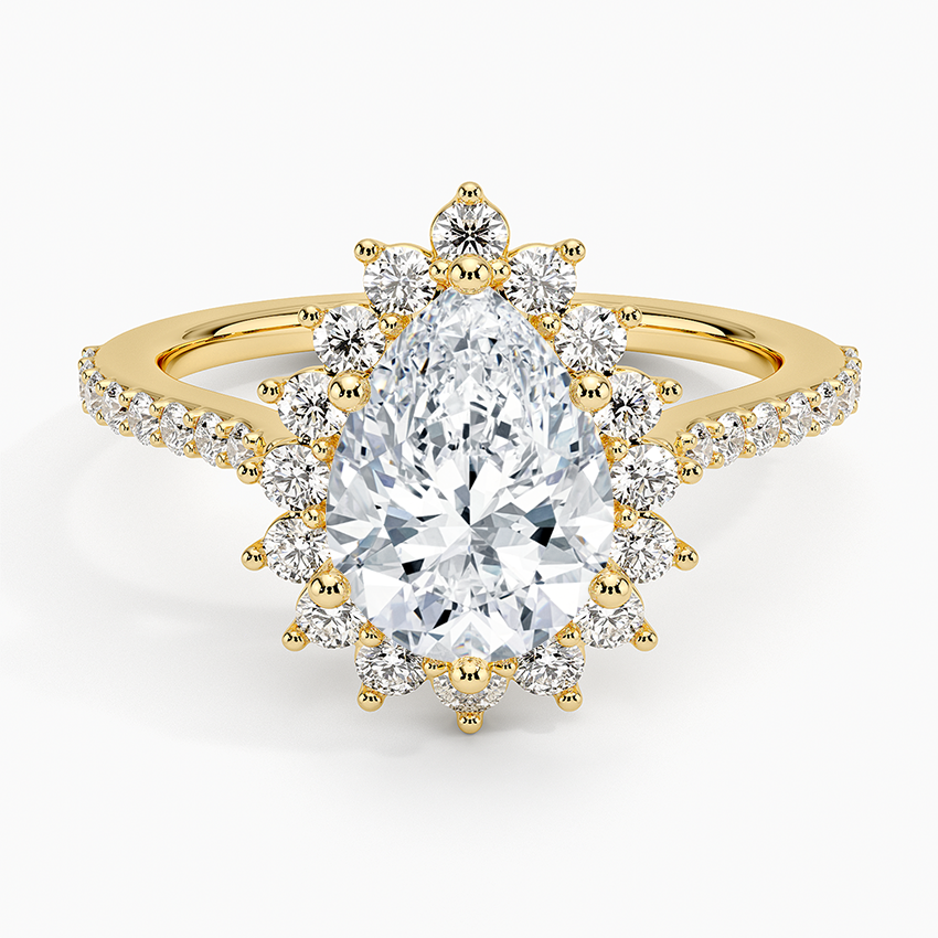 This Sun Pear Lab Grown Diamond Engagement Ring features a stunning sun rays halo design, adorned with sparkling lab grown diamonds. Its pave detailing adds a touch of elegance, perfect for any special occasion wear or as an eye-catching piece for party wear. Elevate your style and make a statement with this exquisite ring.