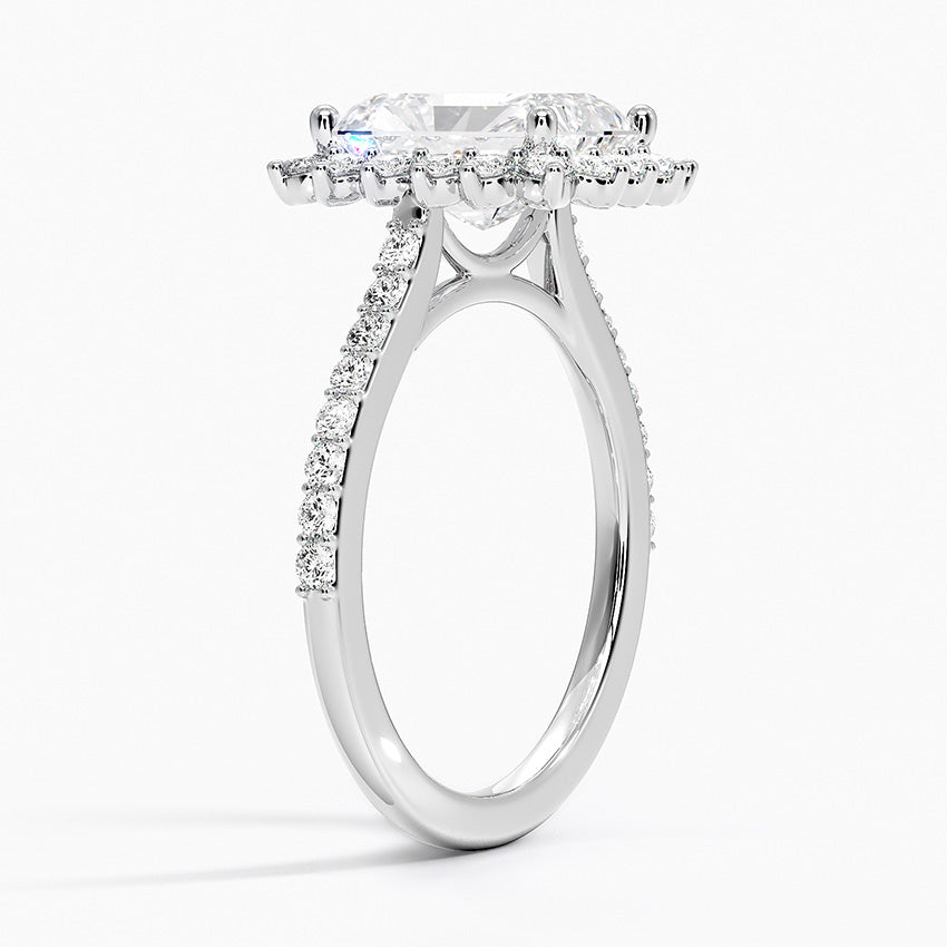 This Sun Radiant Lab Grown Diamond Engagement Ring features a stunning sun rays halo design, adorned with sparkling lab grown diamonds. Its pave detailing adds a touch of elegance, perfect for any special occasion wear or as an eye-catching piece for party wear. Elevate your style and make a statement with this exquisite ring.