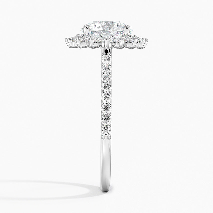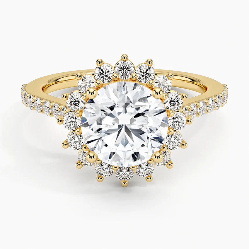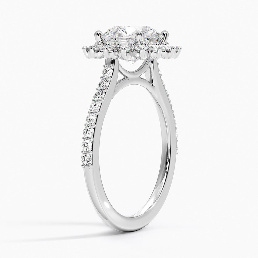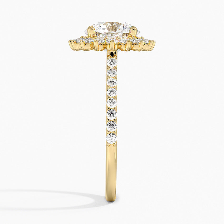 This Sun Round Lab Grown Diamond Engagement Ring features a stunning sun rays halo design, adorned with sparkling lab grown diamonds. Its pave detailing adds a touch of elegance, perfect for any special occasion wear or as an eye-catching piece for party wear. Elevate your style and make a statement with this exquisite ring.