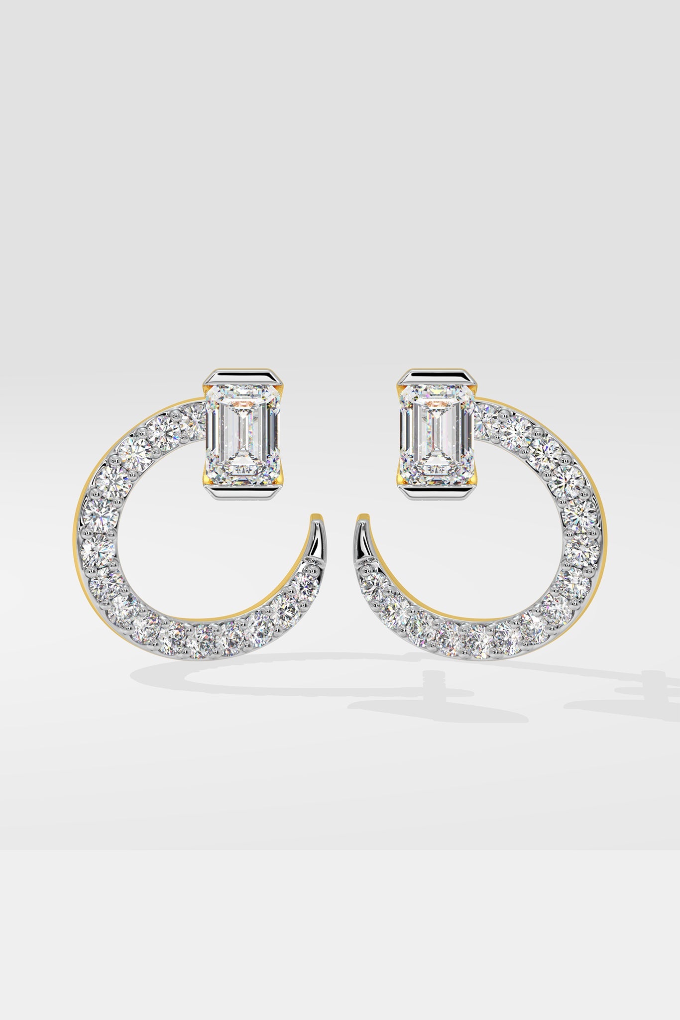 The Emra Solitaire Mini Hoops feature 3/4 ct center emerald cut studs with fully studded angular curved hoops. The hoops are detachable to optionally wear the studs as it is everyday, and glam it up for occasions.