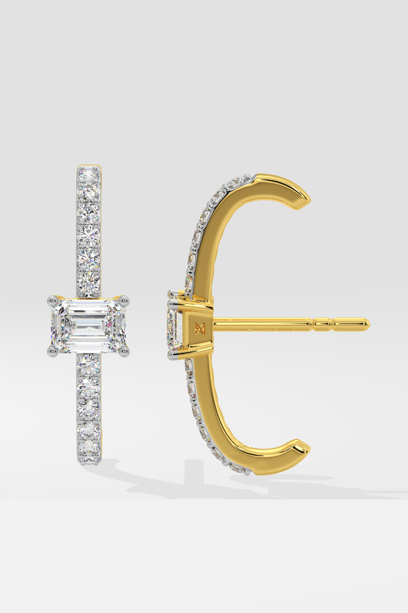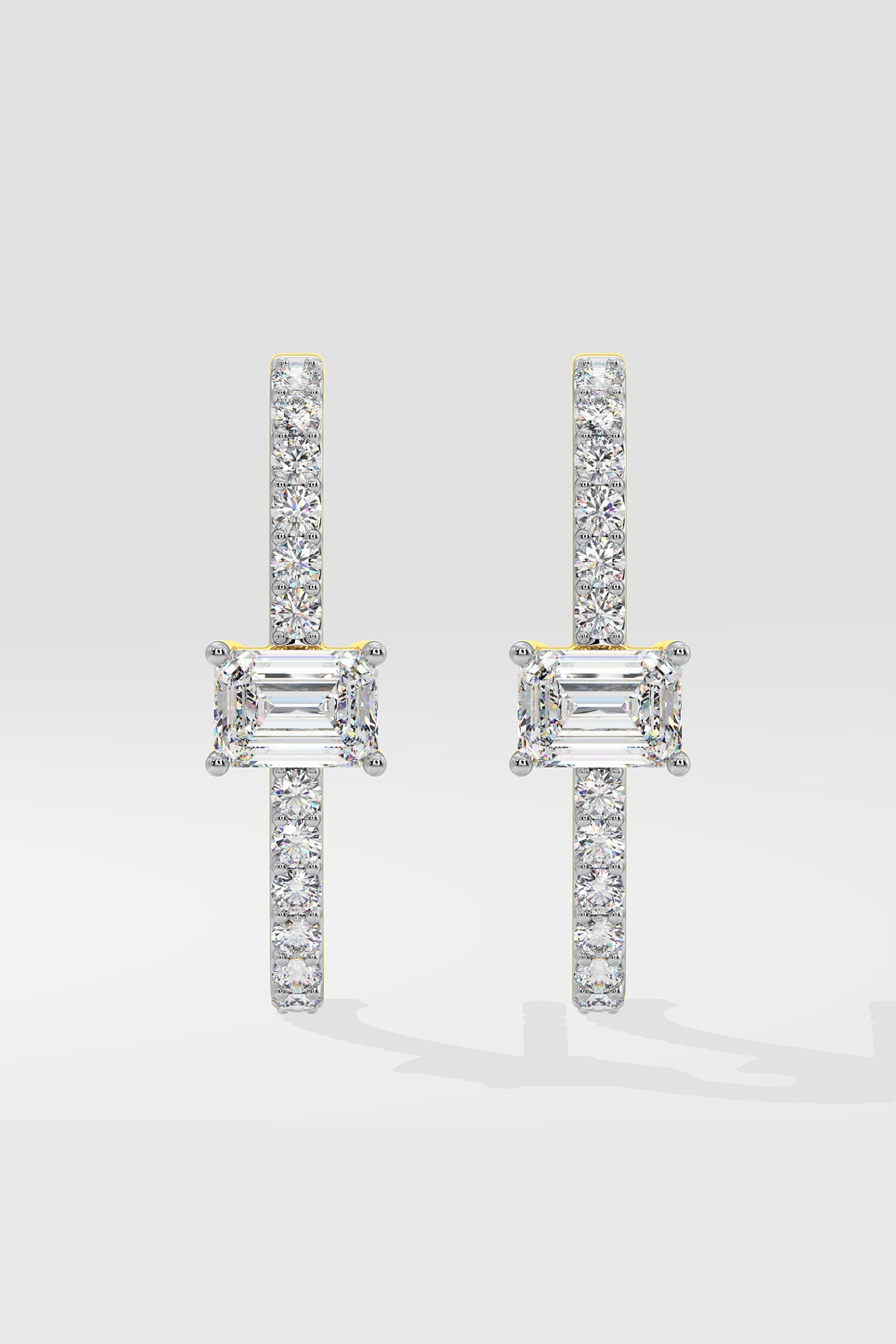 The Vertical Mini Hoops are a signature style from the Emra collection. These vertical hoops feature 3/4 ct center studs with fully studded top and bottom shanks, which sit on the ear comfortably. Uber hot & super cool.