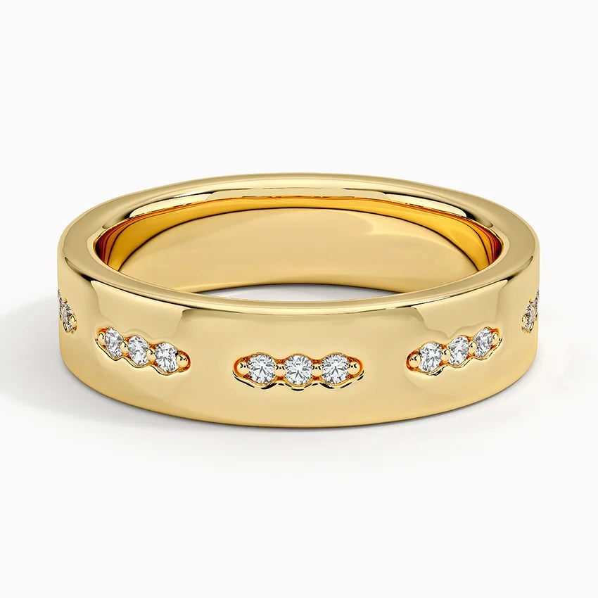 Shining diamonds form trios that wrap all of the way around this unique, handsome design.