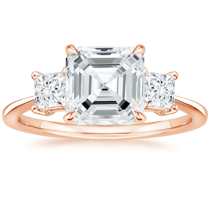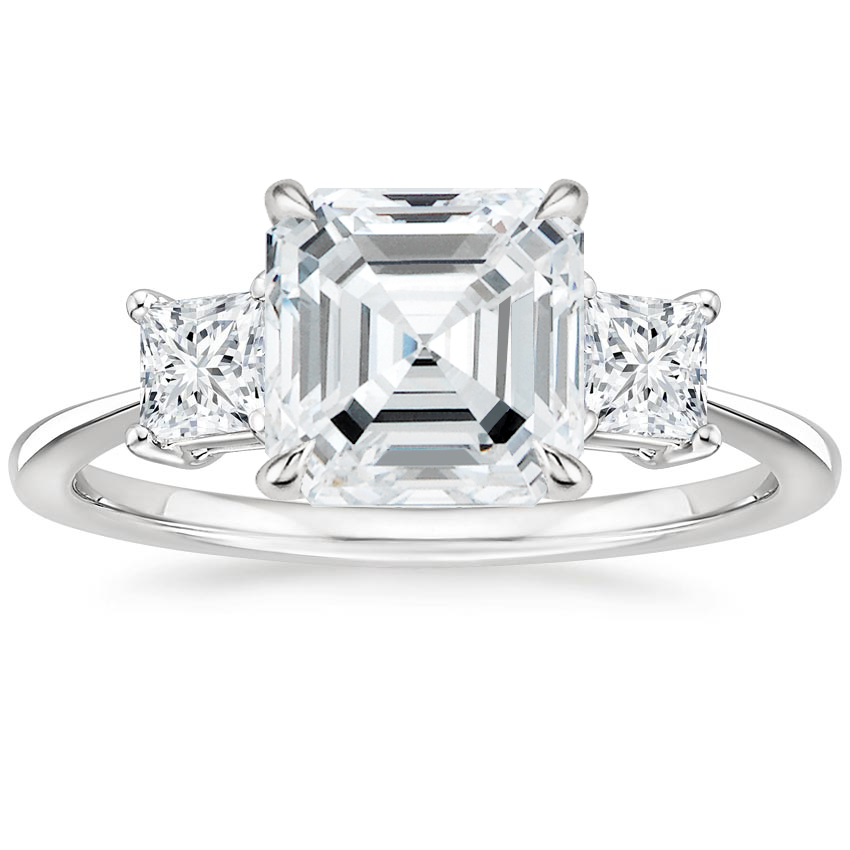 Elevate your proposal with this magnificent Triplets Asscher Cut Engagement Ring. Featuring princess accent side stones, lab grown diamonds, and a stunning three stone design. Enjoy the beauty and quality of lab grown diamonds at a fraction of the cost.