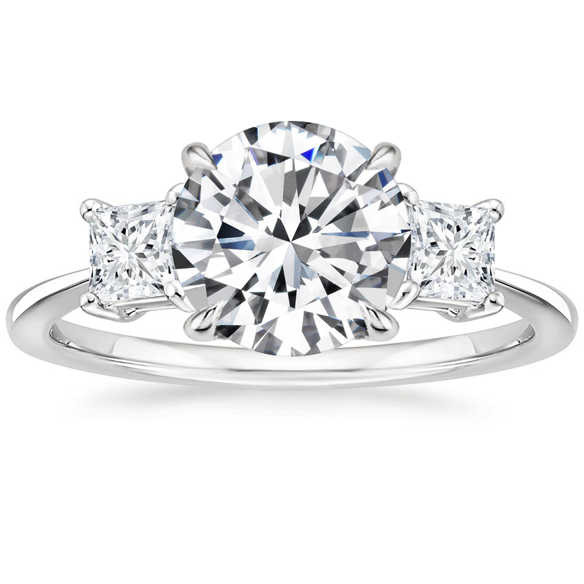 Elevate your proposal with this magnificent Triplets Round Cut Engagement Ring. Featuring princess accent side stones, lab grown diamonds, and a stunning three stone design. Enjoy the beauty and quality of lab grown diamonds at a fraction of the cost.