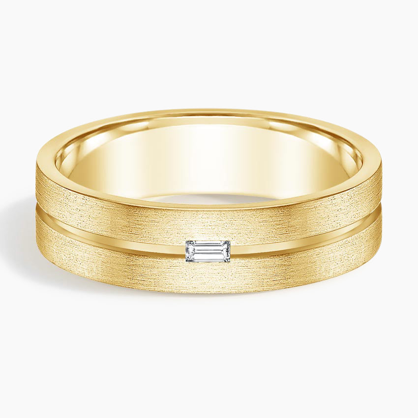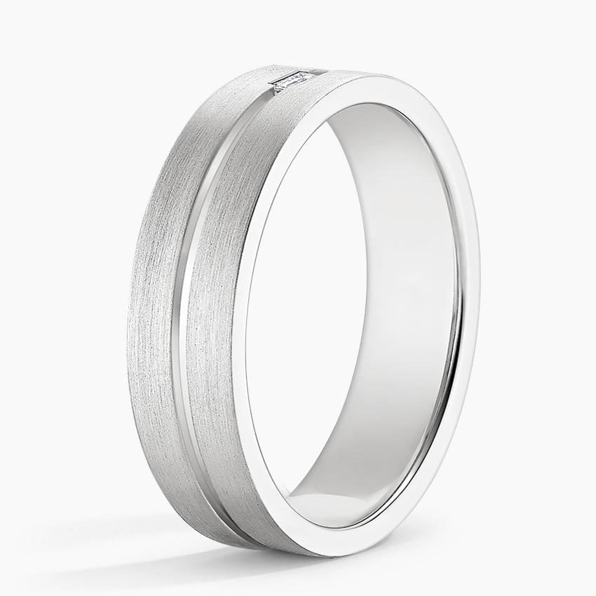 This unique ring features a high polish groove inlaid within a contemporary matte band. An alluring baguette diamond adds an eye-catching flair.